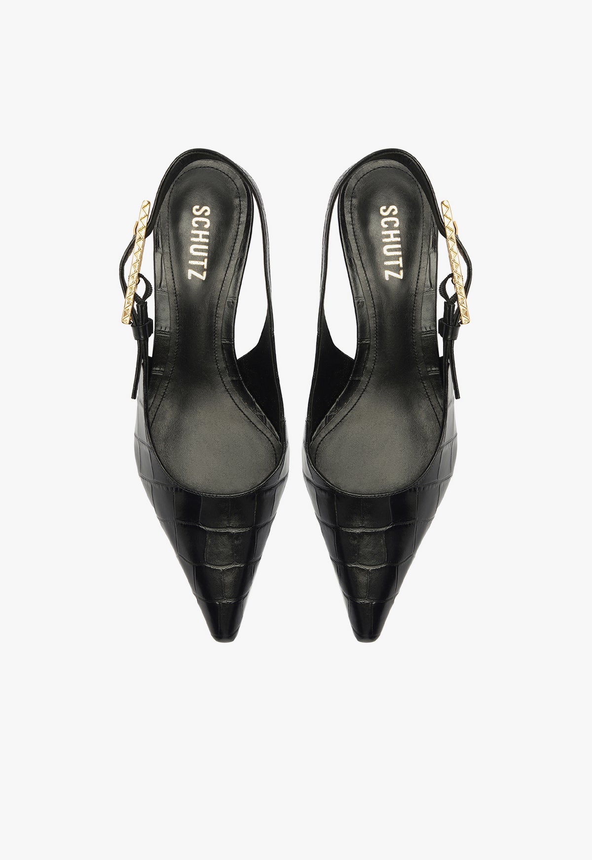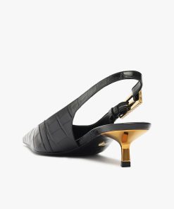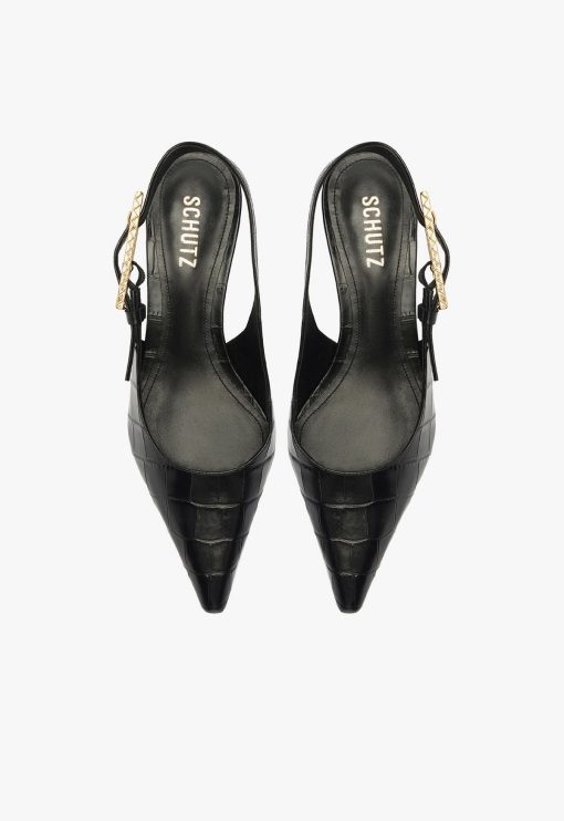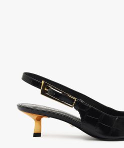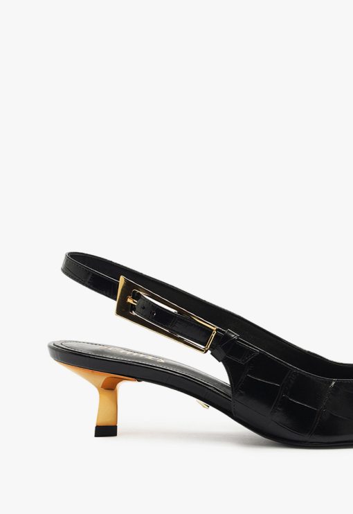 The Ciaras are a sleek and elegant combination of style and poise. The pointed toe gives these pumps a timeless appeal, while the subtle crocodile texture adds a touch of luxury. The slingback strap, adorned with a delicate gold buckle, perfectly complements the low, comfortable heel, making it a versatile choice for day and evening wear. Ideal for adding a chic edge to any outfit, the Ciaras are here to have you exuding confidence and class.