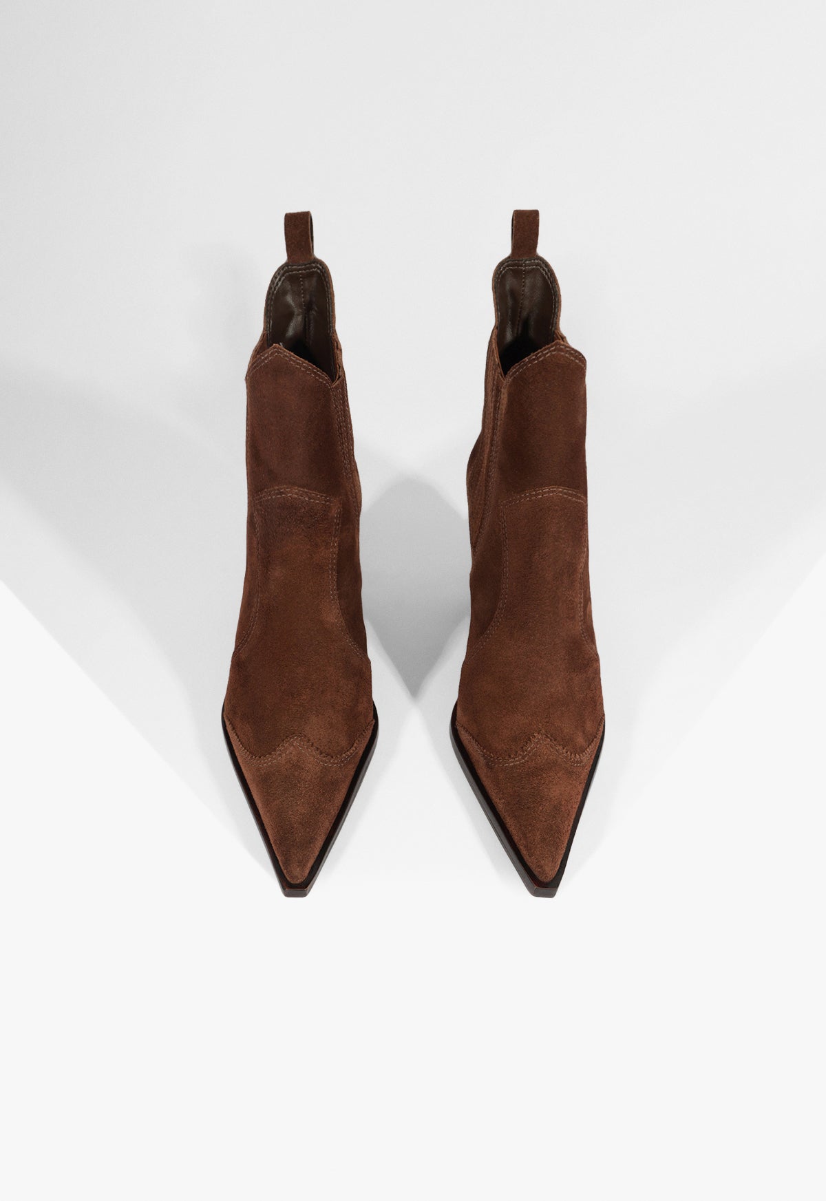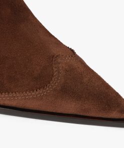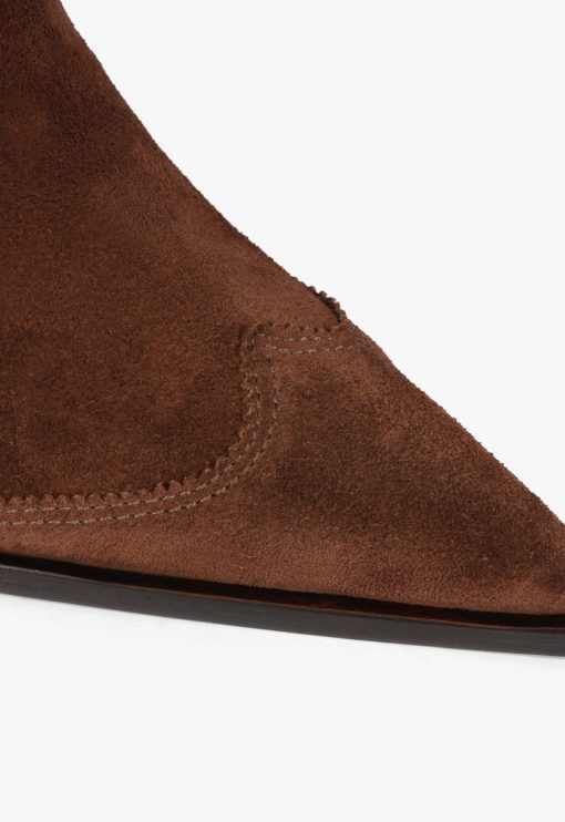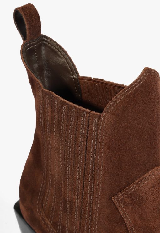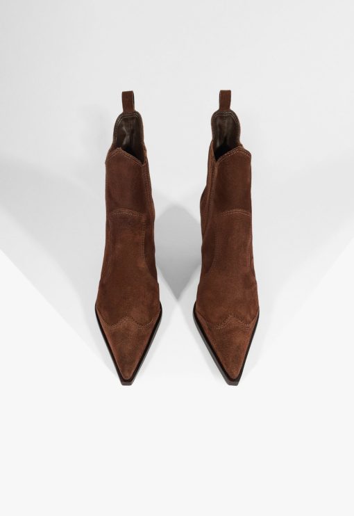 Dolly in suede is the desert soul of your fall wardrobe—warm, worn-in, and ready for anything. Its bold heel and pointed toe accentuate the drama, while the deep brown suede maintains an earthy and cool tone. The pull-on tabs and stretch sides make them easy to put on and take off. Style them with layered knits or your favorite cutoff shorts and a blazer. It’s that blend of rustic and runway that makes them a standout.