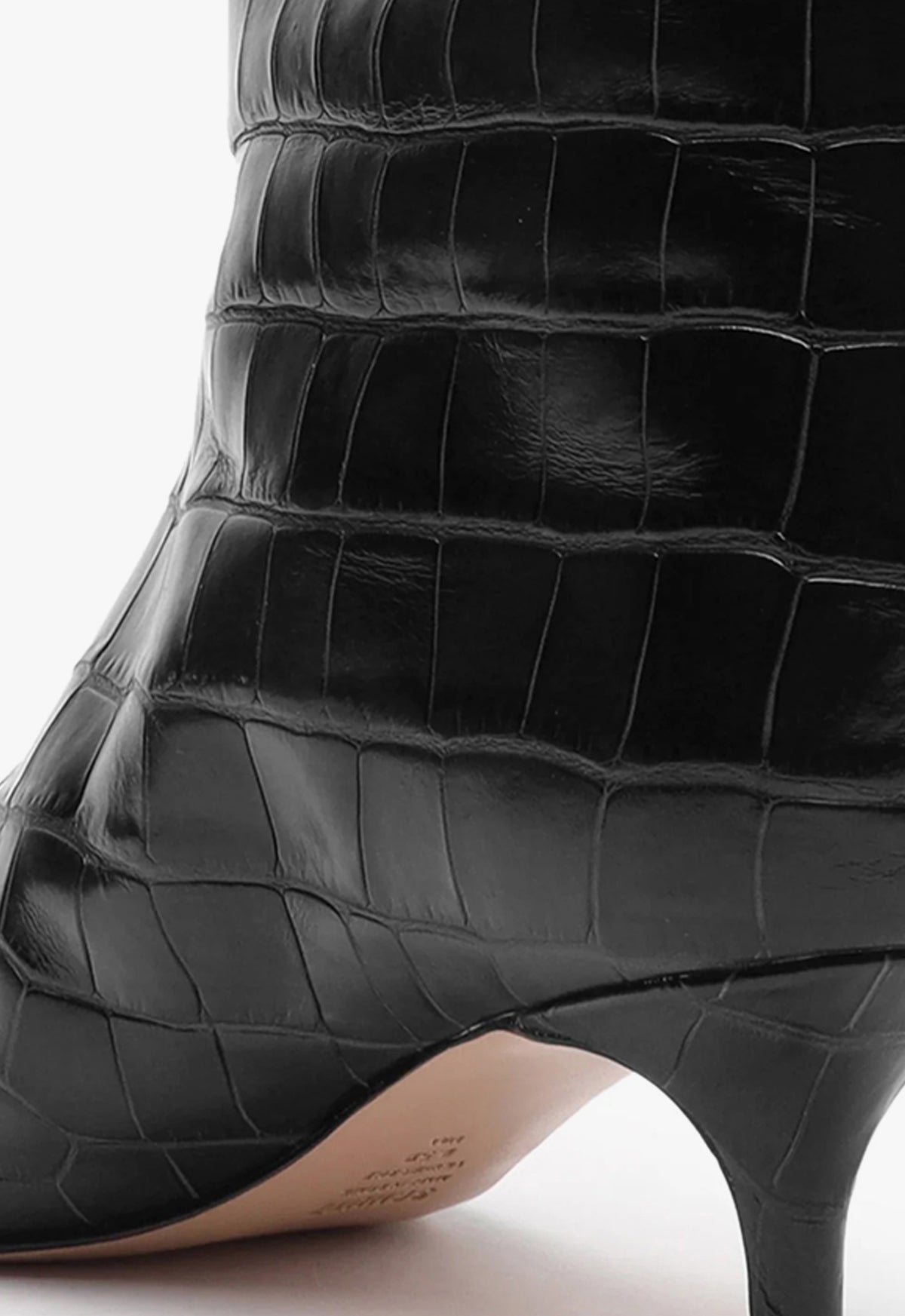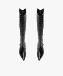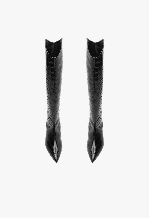 Maryana’s exquisite heel undergoes a sophisticated transformation, emerging even more refined and captivating, now cloaked in the rich texture of crocodile-embossed leather. The knee-high silhouette exudes a sense of streamlined elegance, gracefully adorned with a delicately pointed toe and an artfully proportioned kitten heel, ensuring a subtly elevated and comfortably stylish stride.