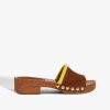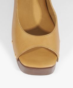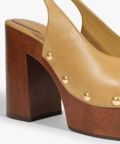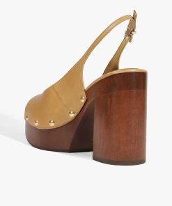 The Rose sandal blends soft fig-toned leather with bold wood for a platform that’s anything but shy. Gold studs wrap the base, adding just the right flash of hardware. The chunky block heel brings serious height, balanced by a walkable platform. A slingback strap keeps things grounded. Pair it with structured separates, or go full retro with wide-leg denim.