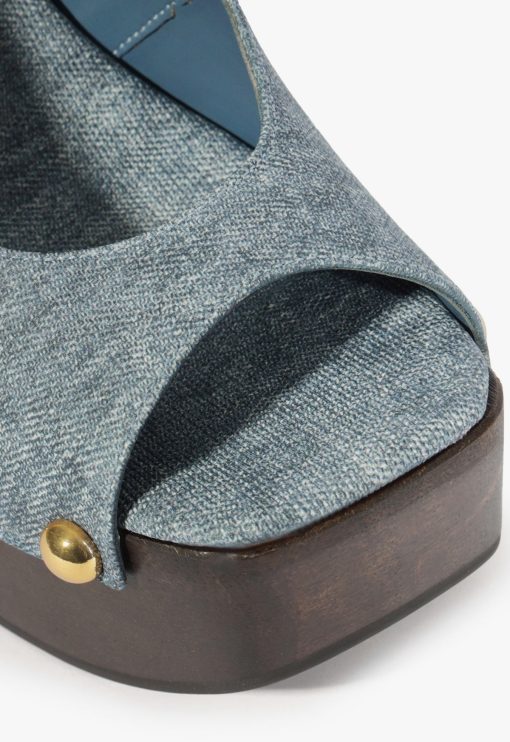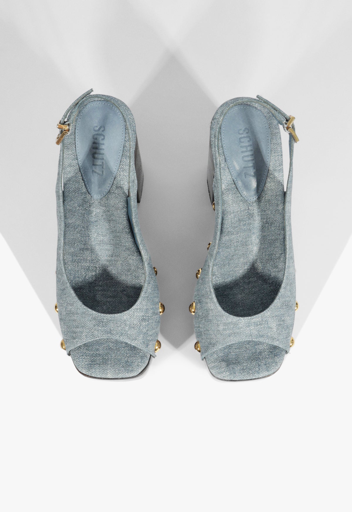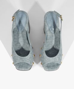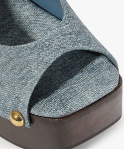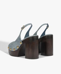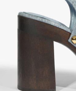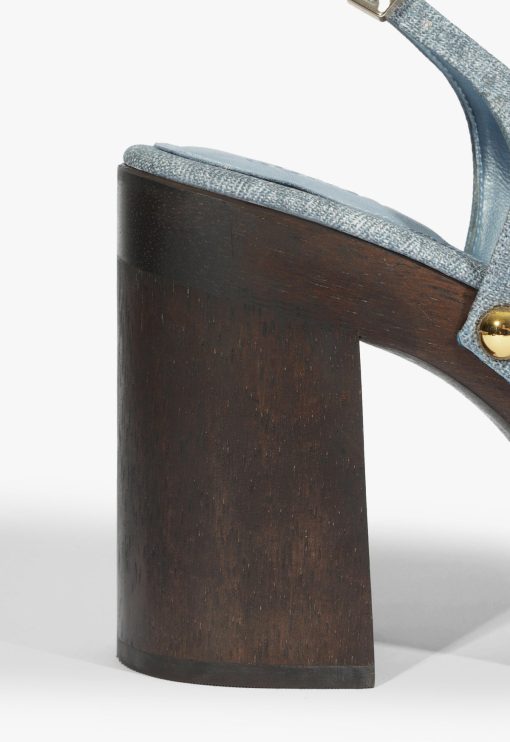 The Rose sandal blends soft blue leather with bold wood for a platform that’s anything but shy. Gold studs wrap the base, adding just the right flash of hardware. The chunky block heel brings serious height, balanced by a walkable platform. A slingback strap keeps things grounded. Pair it with structured separates, or go full retro with wide-leg denim.